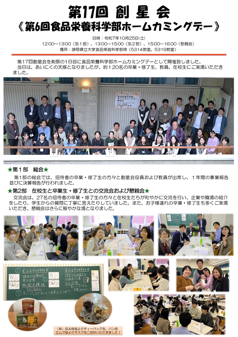 静岡県立大学 食品栄養科学部及び大学院食品栄養化学専攻 「創星会」はこれら学部・専攻の卒業生・修了生と、教員からなる会です